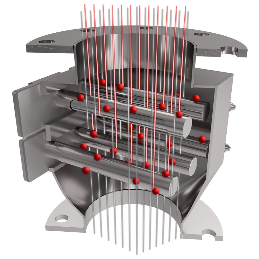 This magnetic separator captures (separates) magnetic metal particles from a size of 1 µm and smaller (ferromagnetic in nature, immeasurable, magnetic dust) up to a size of approx. 5 mm (5x5x5 mm), which is the maximum fraction (size) of material that may fall onto the magnetic separator and that may be poured through the magnetic separator. In rare cases, the magnetic separator can also capture larger metal objects up to a size of approx. 10 mm (10x10x10 mm). However, a random occurrence of these impurities is assumed at max. up to 1% of the total hourly throughput capacity of the poured material (regular cleaning of the magnetic separator from ferromagnetic impurities is assumed; this does not mean that the entire 1% of larger ferromagnetic impurities may remain on the magnetic tubes for the entire time of pouring the hourly capacity of the poured material). The content of these larger ferromagnetic impurities must not be higher. If the occurrence of these larger ferromagnetic impurities in your material is higher, do not use this magnetic separator and contact our technical-commercial department for professional advice. Larger objects than stated (max. diameter 5 mm, 5x5x5 mm) must not fall into the magnetic separator (onto the magnetic grates), except for the ferromagnetic impurities described above in a random amount. If you are concerned about the presence of even larger ferromagnetic or other impurities/admixtures, it is necessary to install a screen with a mesh size of max. 5 mm upstream so that these larger unwanted objects are captured before entering the magnetic separator (after installing the screen, it is necessary to consider reducing the capacity load/throughput of the magnetic separator). The screen is not part of the magnetic separator delivery. We also point out the possibility that your material may contain a large amount of fine metal impurities (very fine magnetic metal dust smaller than 1 µm), which can coat the magnetic tubes and make the magnetic separator non-passable (fine magnetic particles also pick up the poured material and overload the entire system). At the same time, the magnetic force/efficiency of the magnetic separator will be greatly reduced. If the magnetic tubes immediately after starting the material flow through the magnetic separator become coated and completely “hidden” in iron dust, this is not a defect of the magnetic separator; it is necessary to strengthen magnetic separation with an additional magnetic separator or clean the magnetic grates more often – your material probably contains a very large amount of ferromagnetic particles.