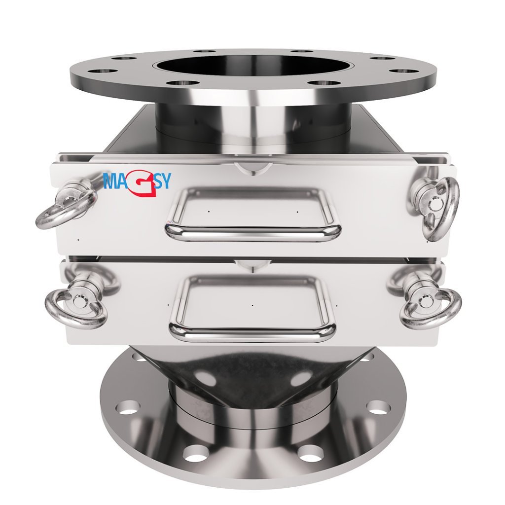 The magnetic separator is suitable for use only in non-continuous operations (during manual cleaning of the magnetic separator, the flow of the purified material must be stopped). It is installed only in vertical pipelines (if vertical installation is not possible, do not use this product and contact us to select another magnetic separator, or to confirm the suitability of its use), e.g. in the food and chemical industries, agriculture, waste-processing industry, and in the production of building materials – see the list of suitable materials below.