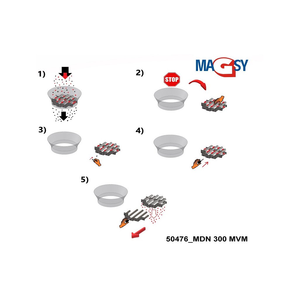 This magnet picks up (separates) metallic ferromagnetic particles from 1 µm and smaller (characteristically ferromagnetic, immeasurable, magnetic dust) up to a size of 3 mm (3x3x3 mm), which is the maximum fraction (size) of material that can fall on the magnet into the hopper and that can be poured over it. In rare cases, this magnet can also trap larger metal objects up to 5 mm (5x5x5 mm) in the hopper. However, it is assumed that these impurities will occur randomly up to a maximum of 1% of the total hourly capacity of the material to be screened (it is assumed that the magnetic grate is cleaned of ferromagnetic impurities regularly, this is not meant to imply that the entire 1% of larger, ferromagnetic impurities may remain on the hopper magnet for the entire time the hourly capacity of the material to be screened is being screened). The content of these larger ferromagnetic impurities must not be higher. If the presence of these larger ferromagnetic impurities in your material is higher, do not use this hopper magnet and contact our sales and technical department for expert advice.