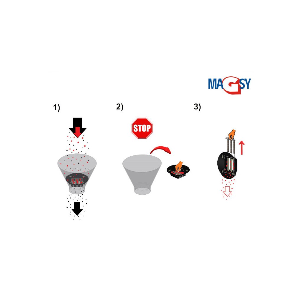 Please note that it is not possible to use pressurised water or soak the magnetic cores during cleaning of the magnetic grid. Only a dry cloth may be used for cleaning or well-dried pressurized air (max. 2 bar) for blowing off residual metallic dirt and separated material.