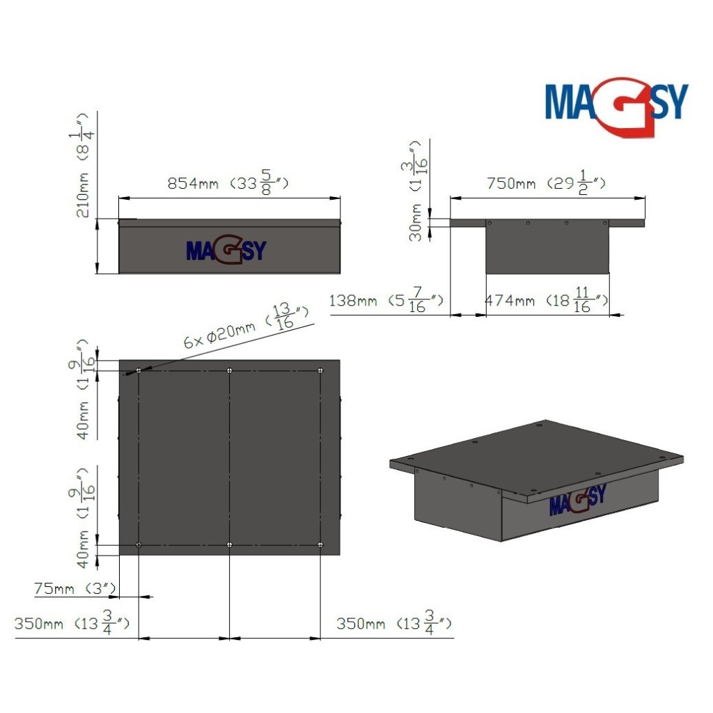 Magnetic plate dimensions are 850x474x180 mm.