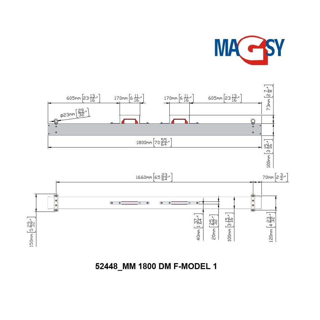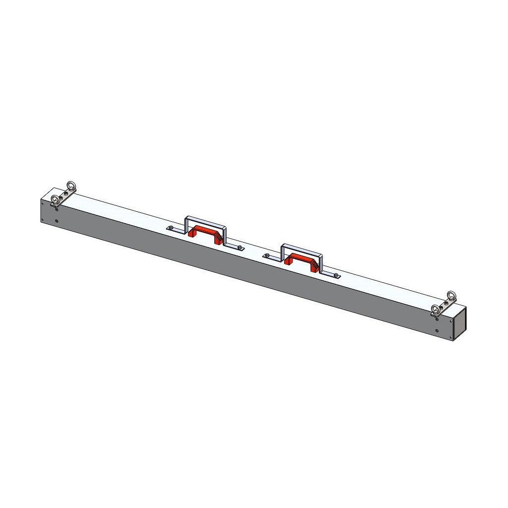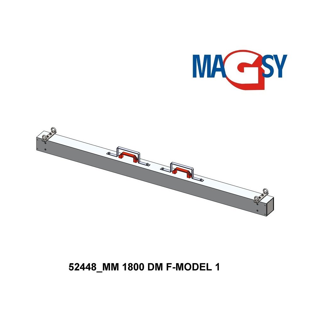 The magnetic broom is suitable for collecting ferromagnetic impurities using a forklift. The broom width is 1,800 mm, it contains ferrite magnets. The magnetic broom is made of EN-AW 6060 aluminium. The broom features a Scotch-Brite brushed surface finish. The maximum working temperature of the magnetic broom is 80°C, and its total weight is 23.4 kg. Connection: 4x suspension eye Ø 23 mm.