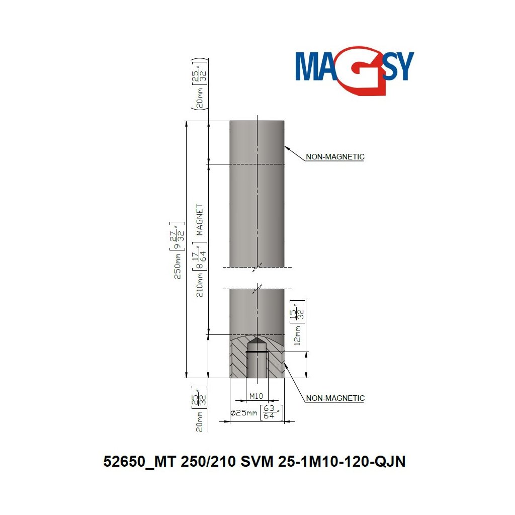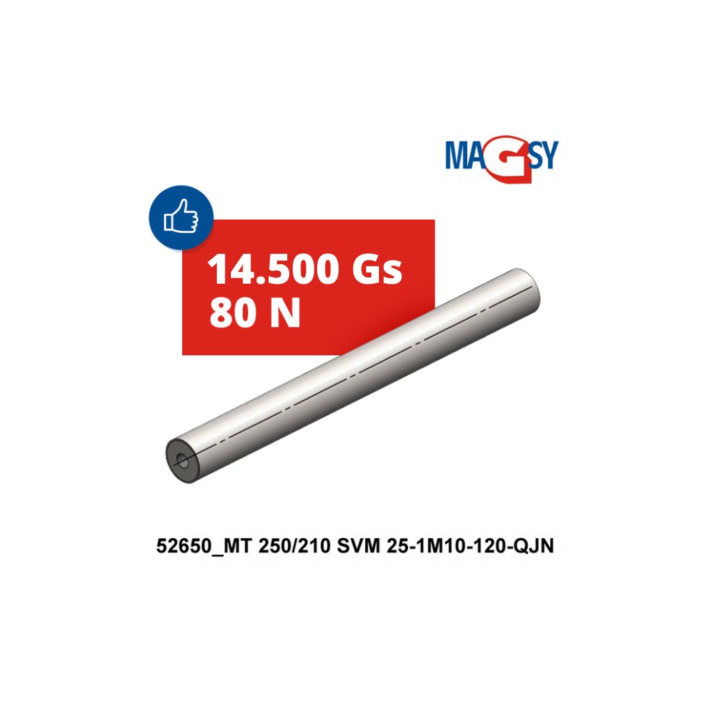 The magnetic bar is primarily designed to create a magnetic grid according to the customer's needs. It has a thread on one side. Using this thread you can screw this rod to any flat steel or to any other auxiliary structure you design. No auxiliary structures or flat steel or brackets or fasteners are included in the delivery of the magnetic bar. Due to the very high magnetic force, please note the necessity to use non-magnetic steel for all materials from which your auxiliary structure or any bracket for attaching the magnetic rods will be made as well as the fasteners must be of non-magnetic design. The minimum distance between the rods when installed on your auxiliary structure, bracket, tape measure must not be less than 20 mm. This is for safety reasons during installation and also to prevent the rods from being pulled by magnetic force. Think also about the properties of the material (bulk and liquid) to maintain the required flow, seepage. If you design the auxiliary magnetic rod holders yourself, we cannot accept any responsibility for the correct function of the magnetic rods. If you are unsure of the installation or assembly to form a magnetic grid, do not purchase a magnetic rod and contact our sales and technical department. Please note the very high intensity of the magnetic force. Take extra care when designing and manufacturing your own assembly to place multiple magnetic bars side by side and especially when screwing (any assembly) into the assembly, separate the individual magnetic bars by a non-magnetic demarcation, e.g. a wooden board. There is an increased risk of injury by connecting the magnetic rods! Keep all magnetic materials, structures, tools such as hammers, pliers, vice grips at a minimum distance of 200 mm from the magnetic bars. Also pay attention to the work table, which must not be iron (ferromagnetic)!