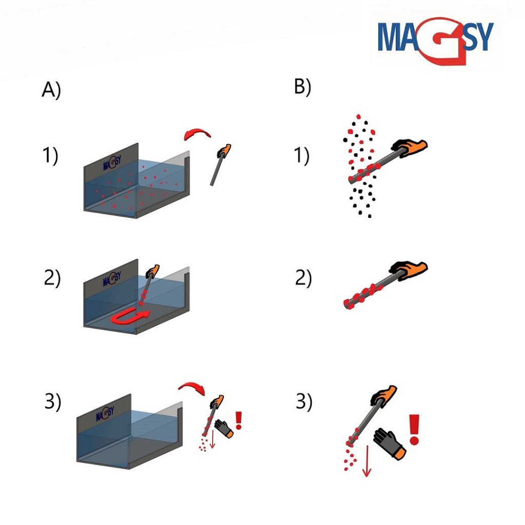 - loose starches e.g. corn starch (spread slowly and evenly over the whole area, risk of arching, if using a set of multiple magnetic rods we recommend a larger spacing between the rods, if using a single rod there is no problem)