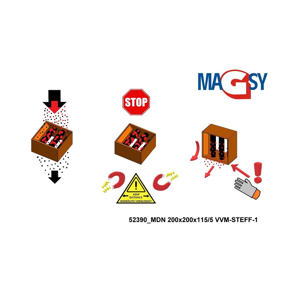 If you are placing the magnetic grid in its own structure (box, hopper, chute, etc.), please note that such structures must not be made of metal (magnetic) material. There is a risk of injury and a significant reduction in magnetic force. All structures in which the magnetic grid is placed must be made of non-magnetic materials. The minimum distance between metal (magnetic) structures and the magnetic grid is 200 mm.